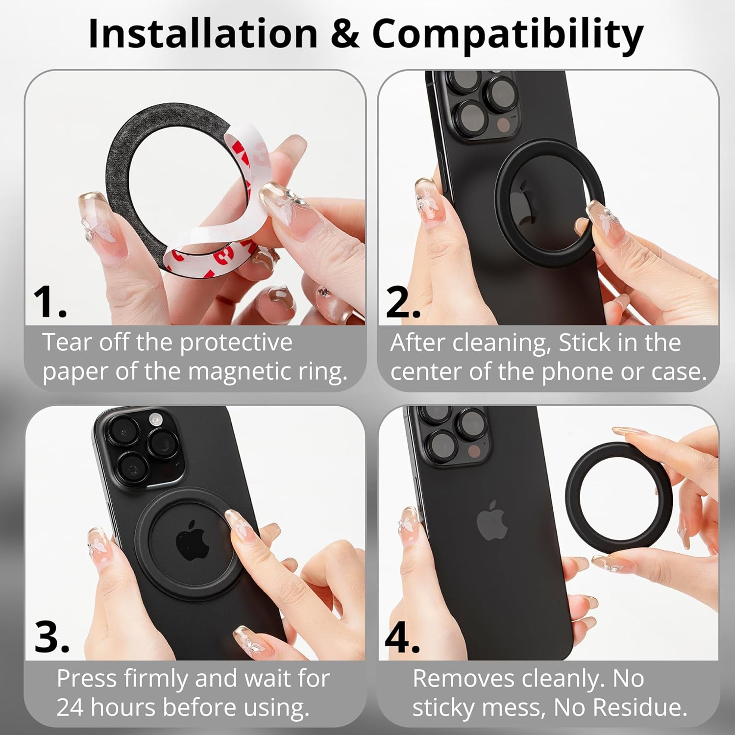 - HOW TO INSTALL: ①Clean the surface of the phone or case before pasting; After pasting, press firmly and wait for 24 hours before using; ②Perfect Align: On phones like iPhone 12+, it snaps right into place. When pasting, you will feel a clear magnetic force; ③Compatible with magsafe phone grip accessories, not compatible with phone cases with built-in phone grip.