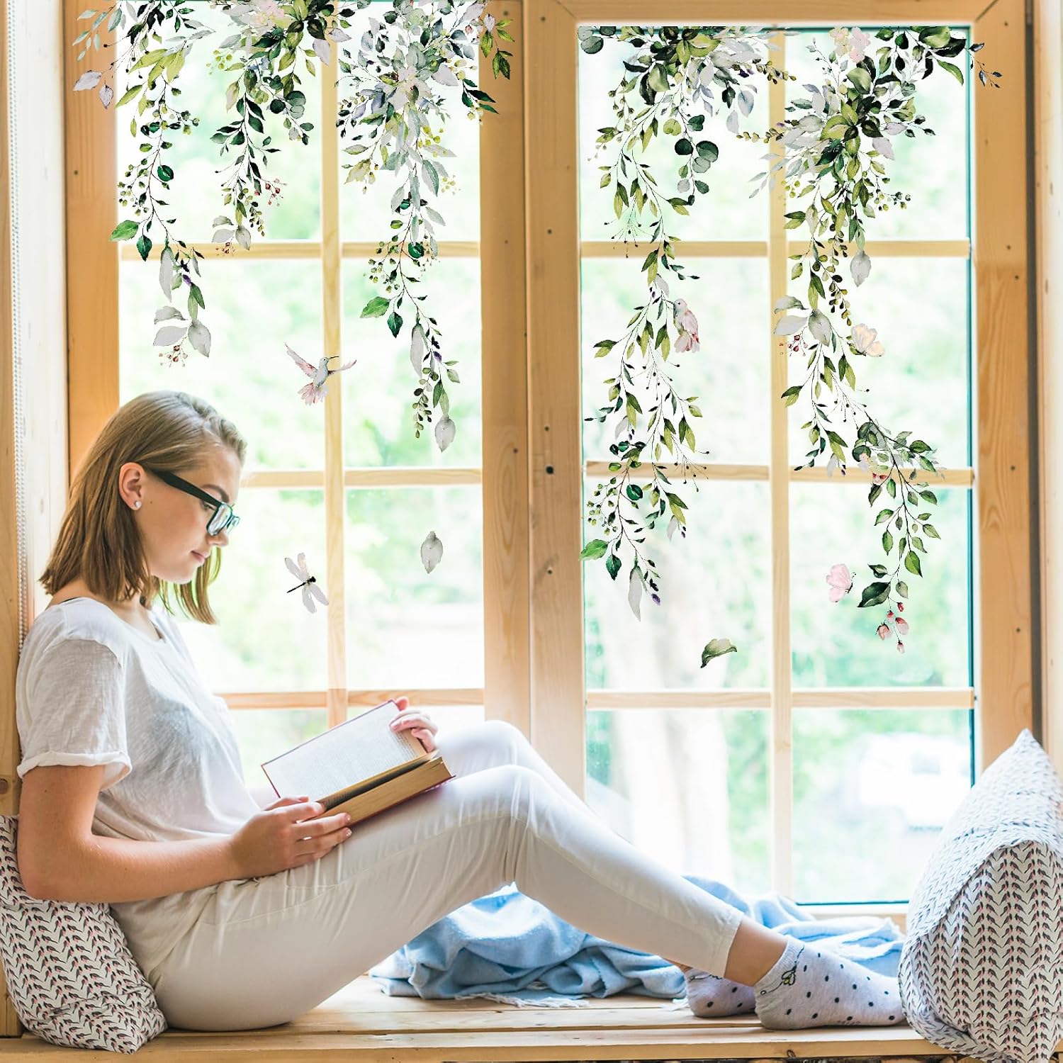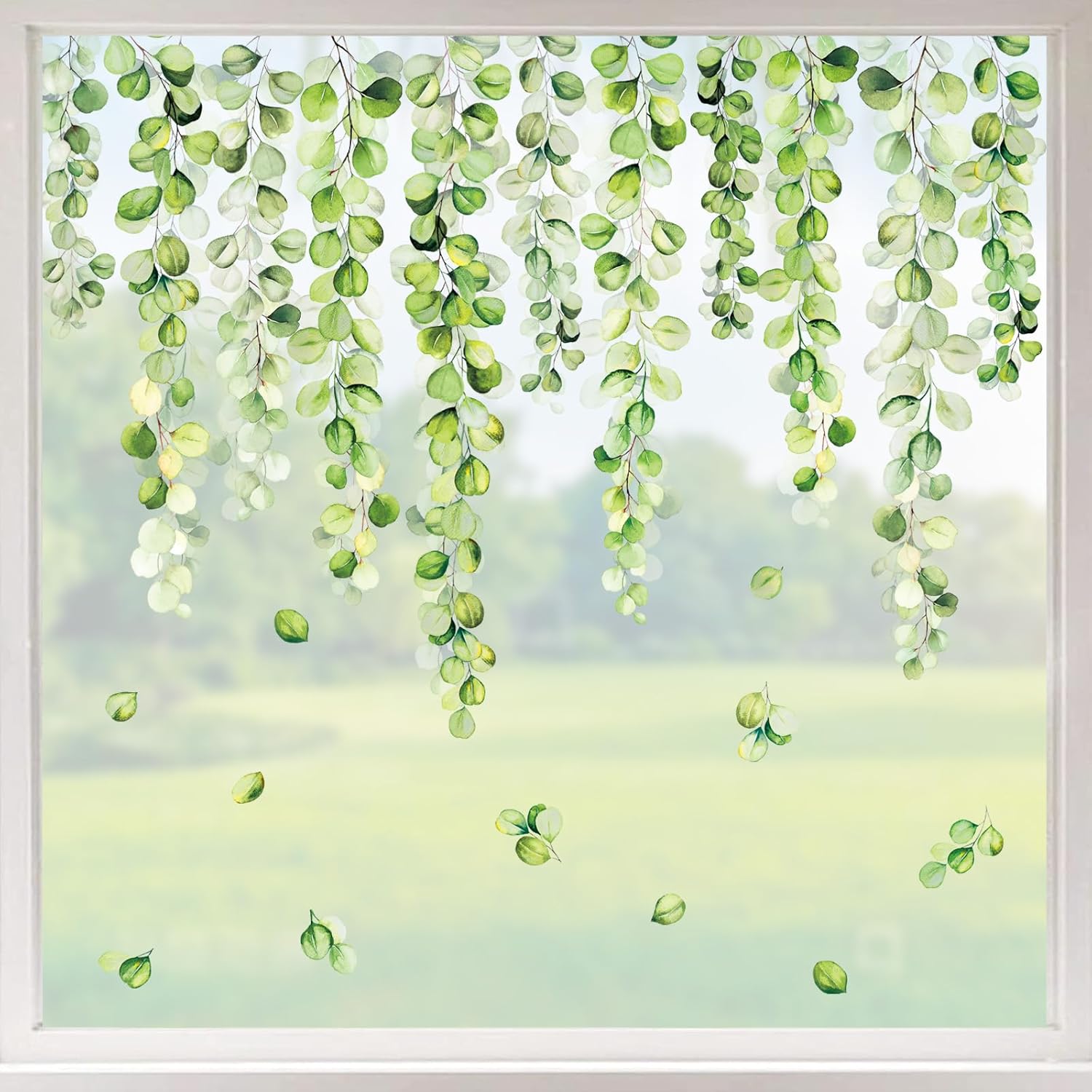 Whaline 9 Sheets Spring Summer Flowers Window Clings Eucalyptus Flower Glass Stickers Plant Hanging Vine Floral Leaf Reusable Decals Window Privacy Film for Wedding Party Home Decor Supplies